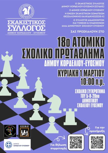Σας προωθούμε την προκήρυξη του 18ου Ατομικού Σχολικού πρωταθλήματος Δήμου Κορδελιού-Ευόσμου, που θα γίνει την Κυριακή 1/3/2026 στις 10:00 π.μ. στον χώρο του 20ου Δημοτικού Σχολείου Ευόσμου (17ης Νοέμβρη και Βεργίνας, Εύοσμος, κλειστό γυμναστήριο)