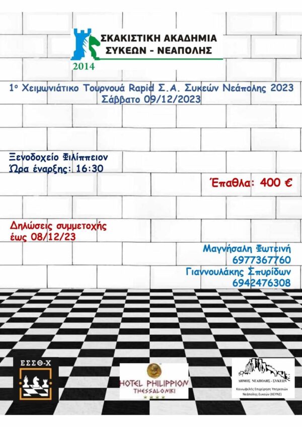 Η Σκακιστική Ακαδημία Συκεών–Νεάπολης, σε συνεργασία με την Ε.Σ.Σ.Θ.-Χ την ΚΕΥΝΣ και το ξενοδοχείο «ΦΙΛΙΠΠΕΙΟΝ» προκηρύσσει το 1ο Χειμωνιάτικο Τουρνουά Rapid Σ.Α. Συκεών Νεάπολης2023, ελβετικό 7 γύρωνμε διεθνή αξιολόγηση και χρηματικά έπαθλα 400 ευρώ, το Σάββατο 09/12/2023 και ώρα έναρξης: 16:30.