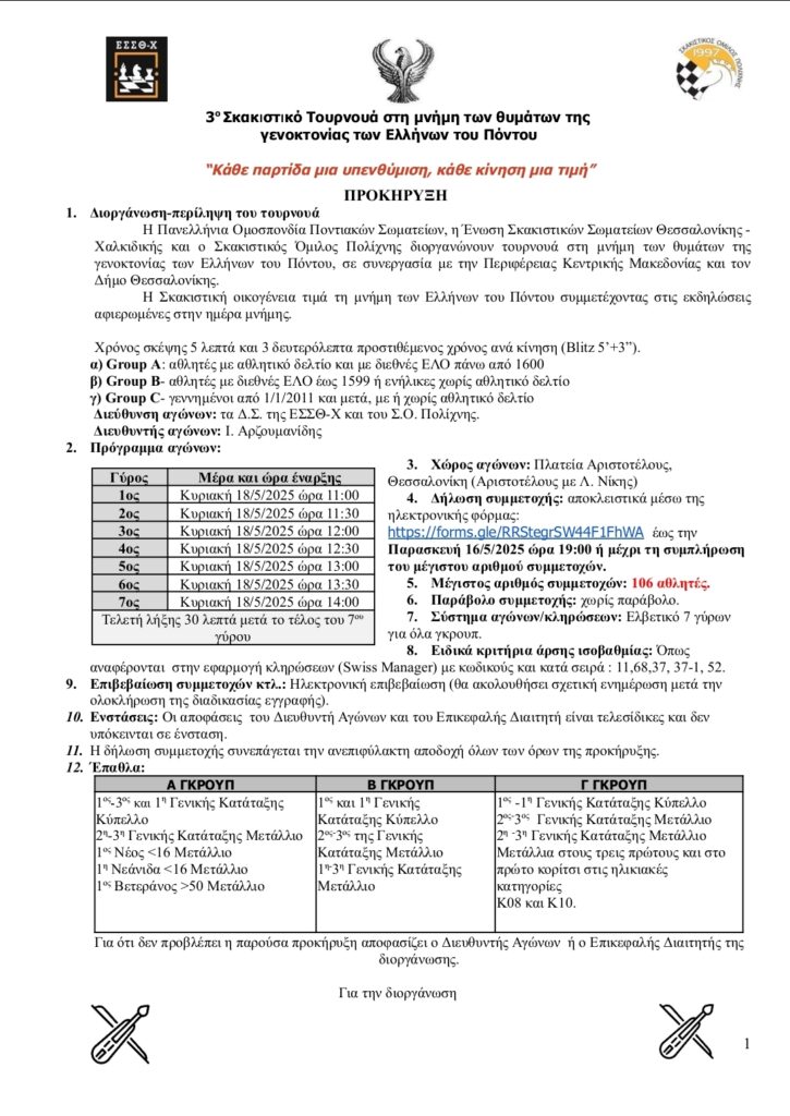 Uncategorized , Μπλιτς-Ράπιντ , Προκηρύξεις 3ο Σκακιστικό Τουρνουά στη μνήμη των θυμάτων της γενοκτονίας των Ελλήνων του Πόντου