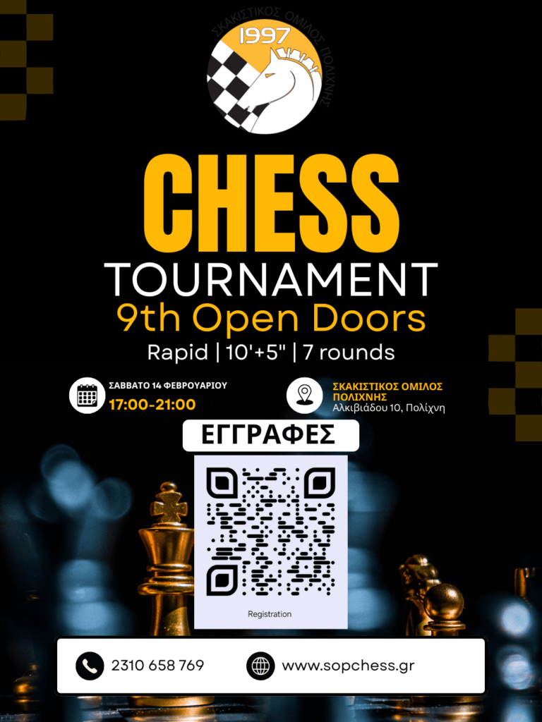 Ο Σκακιστικός Όμιλος Πολίχνης, σε συνεργασία με την ΕΣΣΘ-Χ, διοργανώνει το 9ο Rapid “Open Doors”, διεθνώς αξιολογημένο τουρνουά FIDE Rapid.