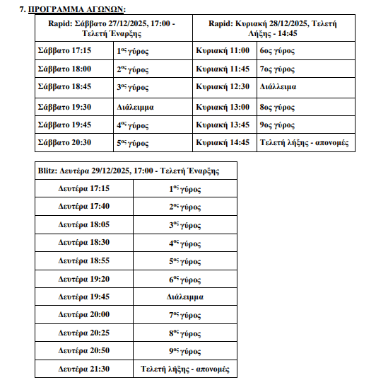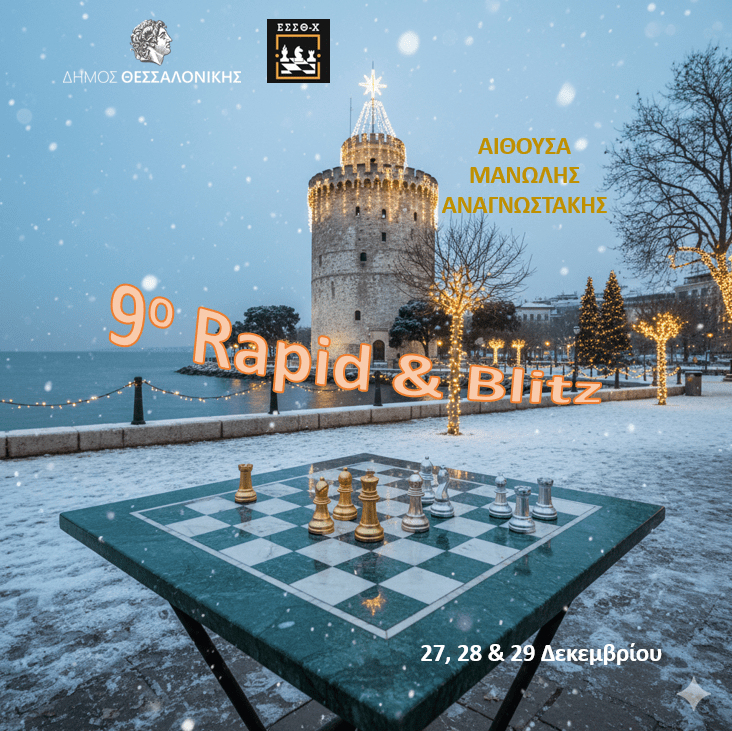 Η Ε.Σ.Σ.Θ-Χ. και ο Δήμος Θεσσαλονίκης συνδιοργανώνουν τα ανοικτά τουρνουά RAPID και BLITZ με την επωνυμία: «9ο ΑΤΟΜΙΚΟ ΤΟΥΡΝΟΥΑ RAPID & BLITZ ¨ΛΕΥΚΟΣ ΠΥΡΓΟΣ¨ 2025», το χρονικό διάστημα από 27 έως 29 Δεκεμβρίου 2025 στην αίθουσα Πολλαπλών Χρήσεων «Μανώλης Αναγνωστάκης», στο Δημαρχείο Θεσ/νίκης, (Λεωφ. Βασιλέως Γεωργίου Α’1).