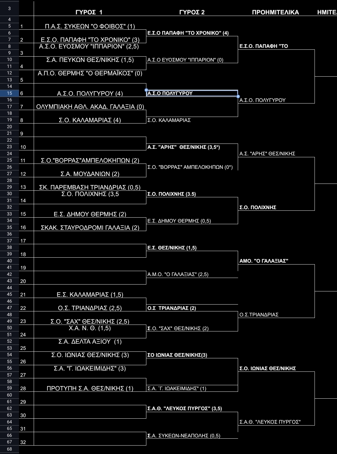Κύπελλο Η ΚΛΗΡΩΣΗ ΤΟΥ ΚΥΠΕΛΛΟΥ Δείτε την κλήρωση πατώντας ΕΔΩ Έντυπο Σύνθεσης Προκήρυξη Το πρόγραμμα αγώνων είναι το εξής:1ος Γύρος: Κυριακή 27/04/2025 στις 17:002ος Γύρος: Σάββατο 10/05/2025 στις 17:003ος Γύρος: Κυριακή 11/05/2025 στις 17:004ος & 5ος Γύρος: Σάββατο 17/05/2025 & Κυριακή 18/05/2025 στις 17:00 Final 4, σε αγωνιστικό χώρο που θα ανακοινωθεί.